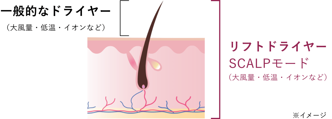 リフトドライヤーは、今生えている髪をいかに速く、綺麗に乾かすかだけではなく、髪の土台に直接アプローチし頭皮からケアをすることを考え開発されました。
