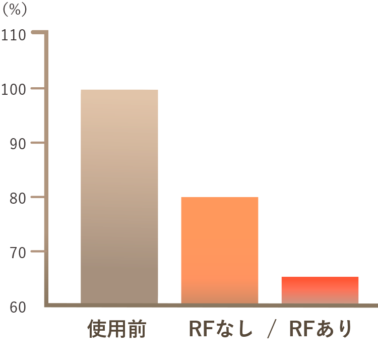 【試験方法】 半顔に試験品のRFシェーバーモード、半顔に試験品のシェーバーモード(RFなし)で鼻下に4往復させたときの残ったヒゲの本数の変化を算出。それぞれ使用前を100%とする。N=12名。