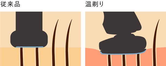従来の回転式シェーバーは、肌への圧力が分散されるので優しく剃れる。 対して温剃りシェーバーはRFで温めることによって肌の弾力値が上がりシェーバーとの密着度が上がる。それによりヒゲが剃りやすい状態が作られ深剃りを実現。